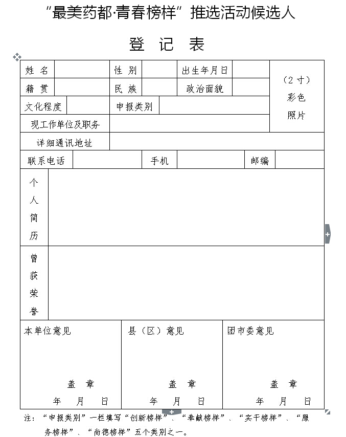 附件:“最美藥都·青春榜樣”推選活動候選人登記表共青團本溪市委員會 本溪市青年聯合會