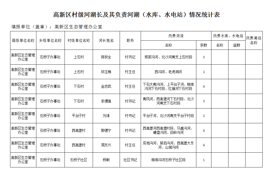 高新區(qū)村級河湖長及其負責河湖(水庫、水電站)情況統(tǒng)計表