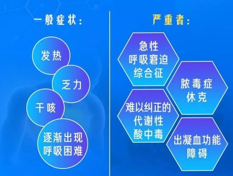 患者主要臨床表現為發熱、乏力,干咳為主要表現,少數患者伴有鼻塞、流涕、腹瀉癥狀。重癥病例多在一周后出現呼吸困難。嚴重者快速進展為急性呼吸窘迫綜合征、膿毒癥休克、難以糾正的代謝性酸中毒和出凝血功能障礙。值得注意的是重型、危重型患者病程中可為中低熱,甚至無明顯發熱。