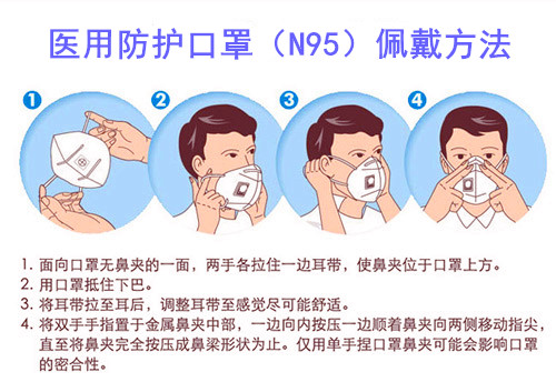 佩戴時,要將折面完全展開,將嘴、鼻、下頜完全包住,然后壓緊鼻夾,使口罩與面部完全貼合。