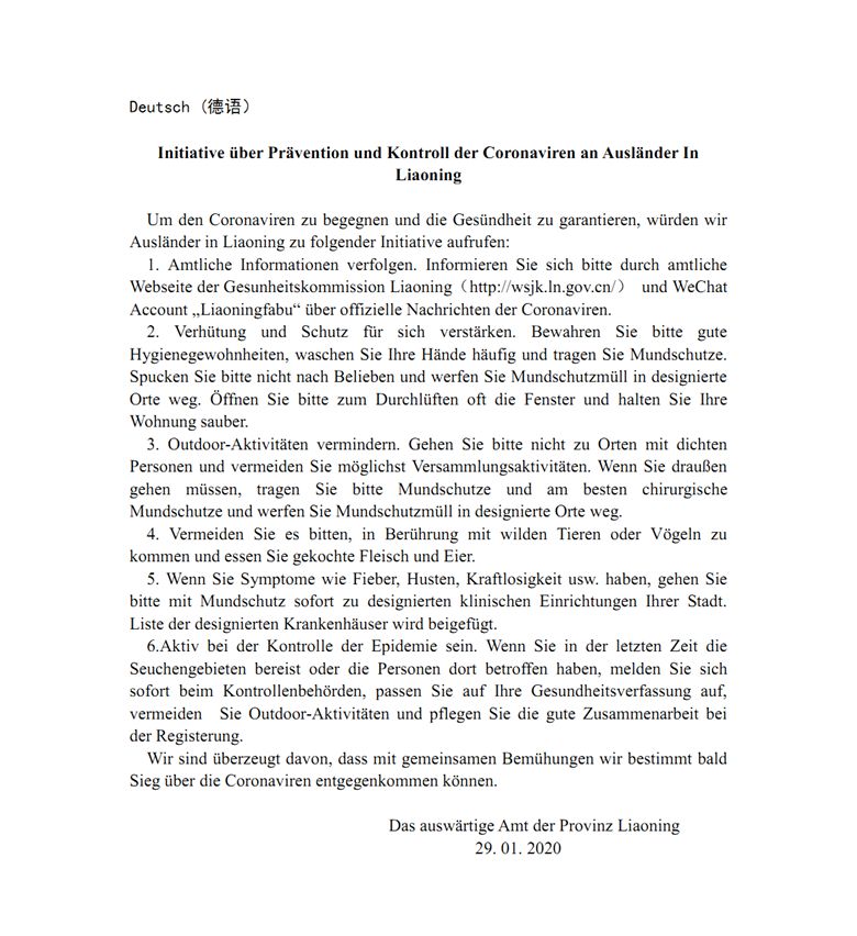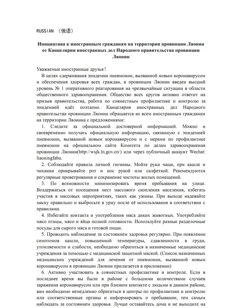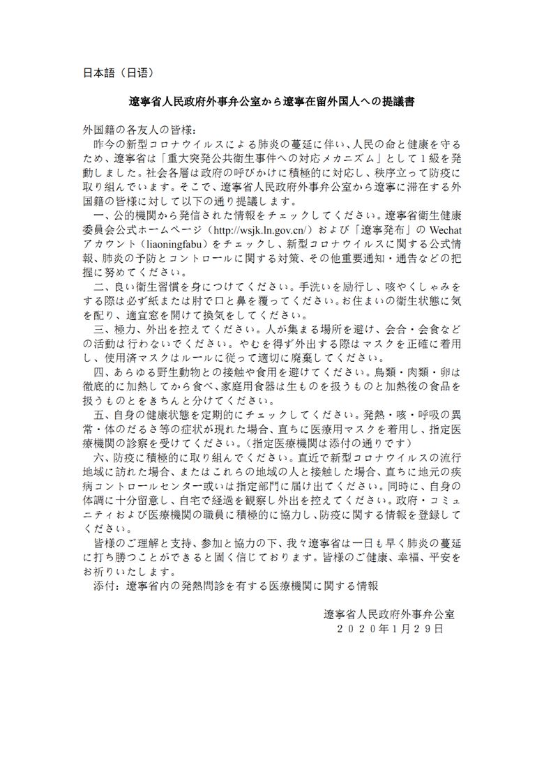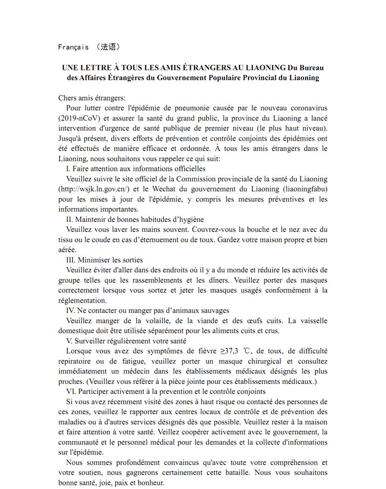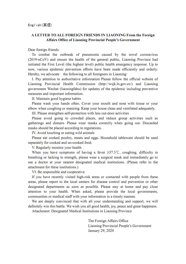 遼寧省人民政府外事辦公室致在遼外籍人士倡議書(中外文版)