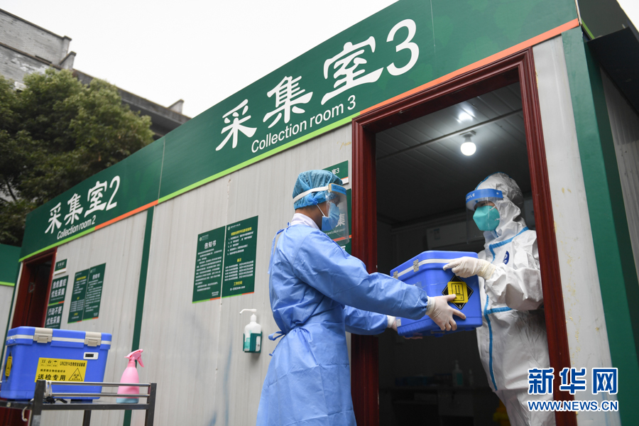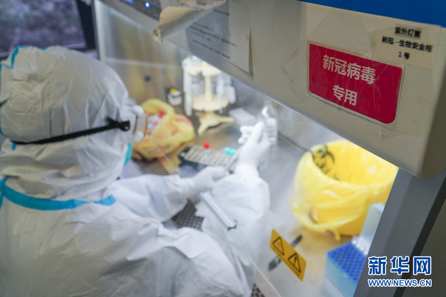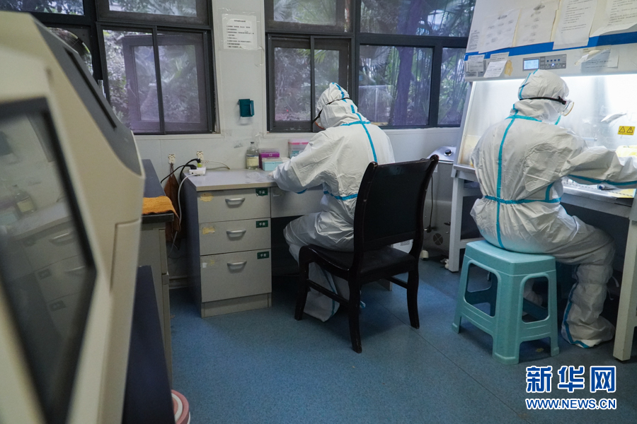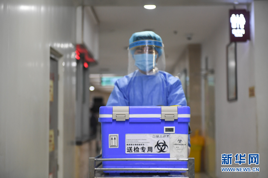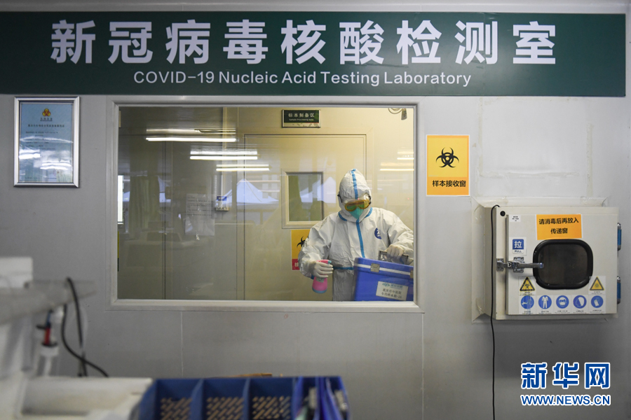 蒲文嬌所做的核酸采集工作,只是核酸檢測工作的第一步。隨后,她要將核酸樣本交給轉運人員,并運送到新冠病毒核酸檢測室。新華網 耿駿宇 攝