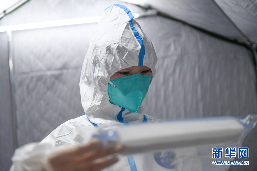 “一天大概要做350多個人的核酸檢測采樣。”蒲文嬌說。為了確保工作細致到位,為了確保工作細致到位,她每天早上六點起床,七點二十到醫院。新華網 耿駿宇 攝