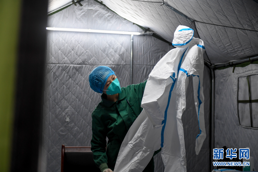 核酸檢測人員正在檢查防護服穿戴,準備進入新冠病毒核酸檢測室。新冠病毒核酸檢測室是一個極其特殊的地方,檢測人員進入檢測室前,要“全副武裝”,確保萬無一失。新華網 耿駿宇 攝