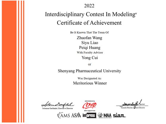近日,2022年美國(國際)大學生數學建模與交叉學科建模競賽成績正式公布,由沈陽藥科大學87期藥物分析四班王卓凡、藥學三班廖思宇、藥學理科基地一班黃佩琦三名同學組成的代表隊,從全球27205支隊伍中脫穎而出,獲得國際一等獎(Meritorious Winner)。這是沈陽藥科大學首次在該項競賽中獲得Meritorious Winner層次獎項,也是沈陽藥科大學在大學生競賽參賽史上獲得的最高層次獎項。
